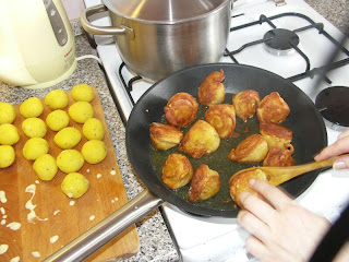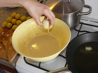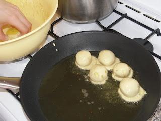 На сковороде растопить масло (можно взять сначала не все, 2/3 части), нужно чтобы масло хорошо прогрелось. Ну а теперь самое интересное. Берем наши картофельные шарики, погружаем в тесто и выкладываем на горячую сковороду.