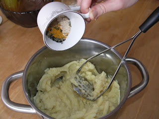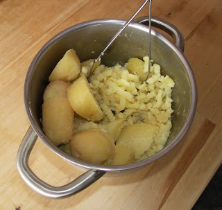 Картофель нужно сварить в мундире (!очень важно — именно в мундире, так у нас получатся правильные шарики, а из обычного пюре они будут не такими, как надо), очистить и помять мялкой или вилкой.